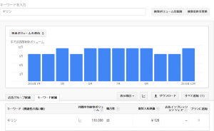 キリンが一カ月でどのくらいの検索数があるのかなどを調べることが可能になります。
